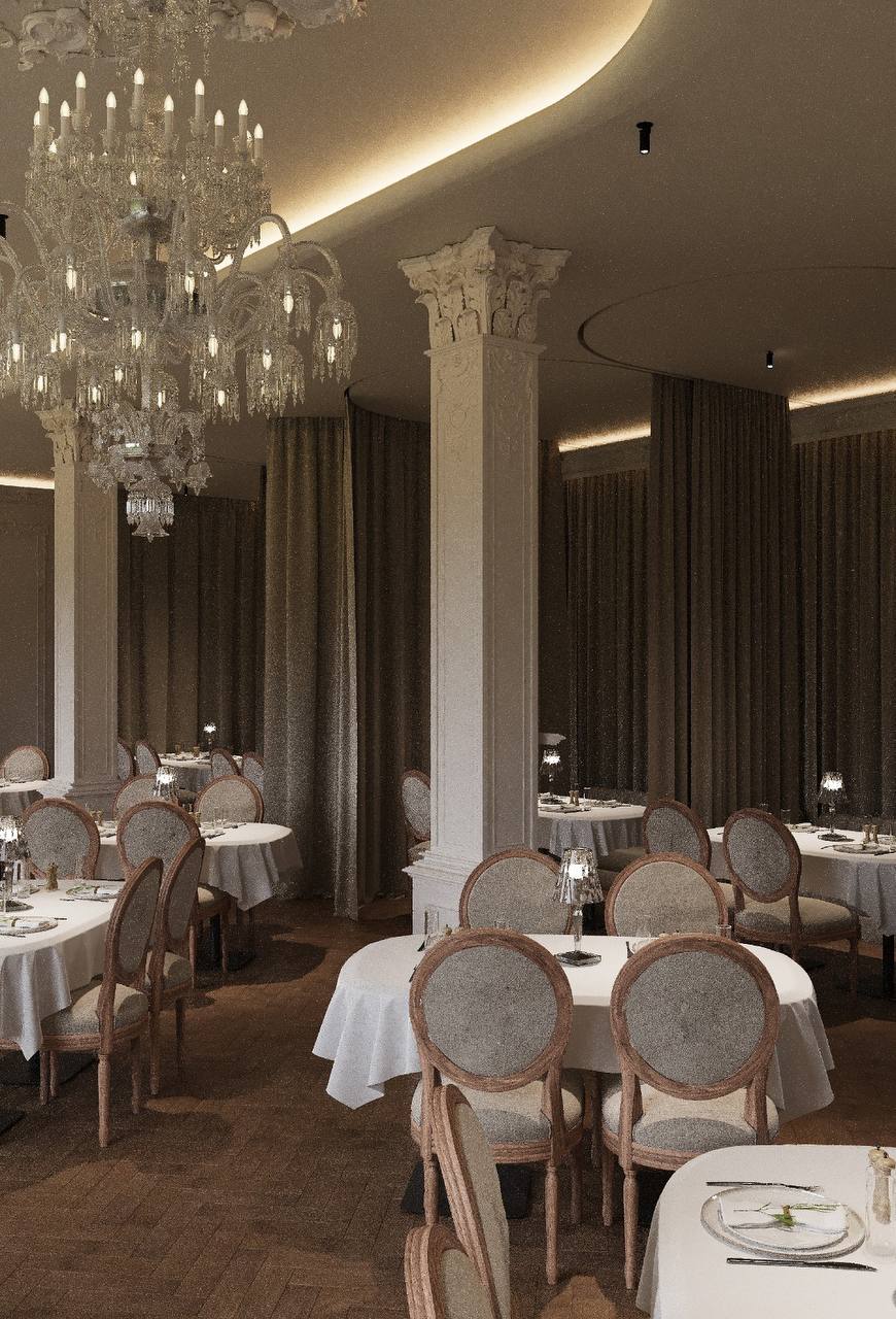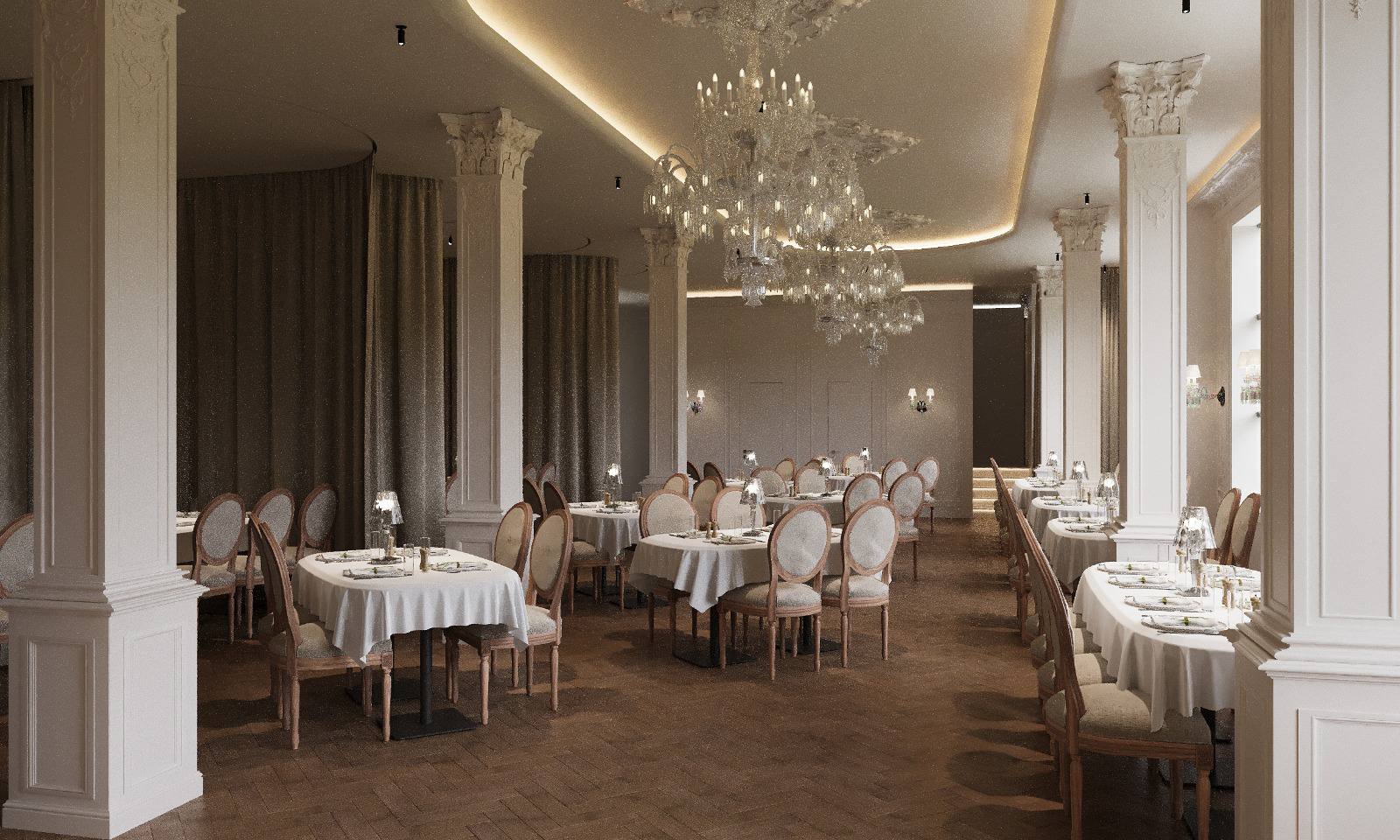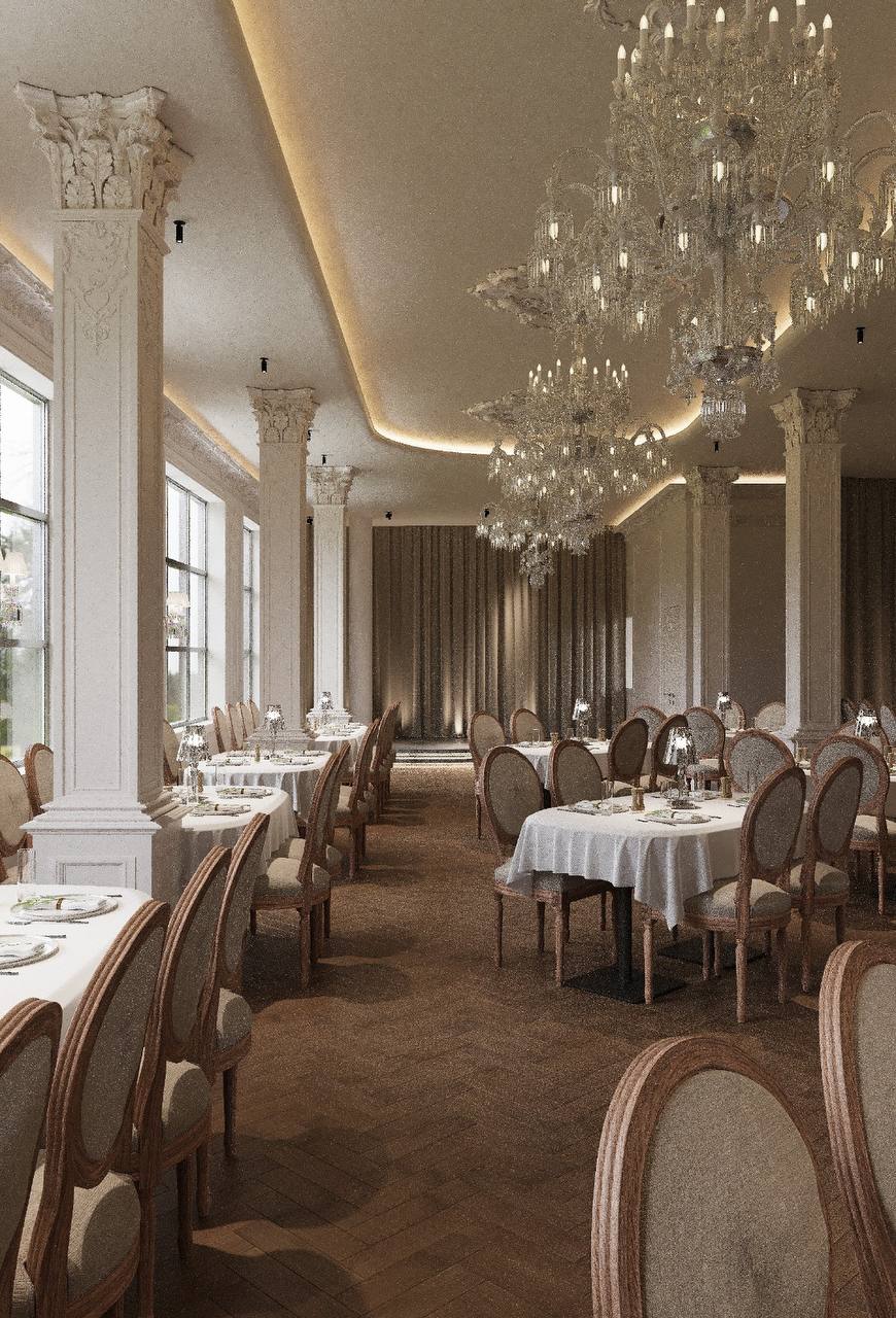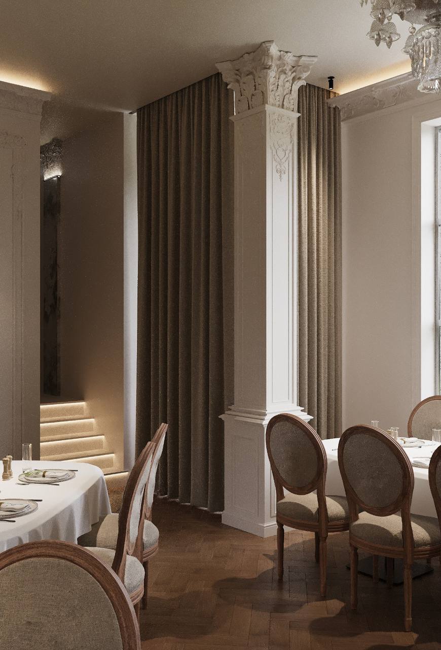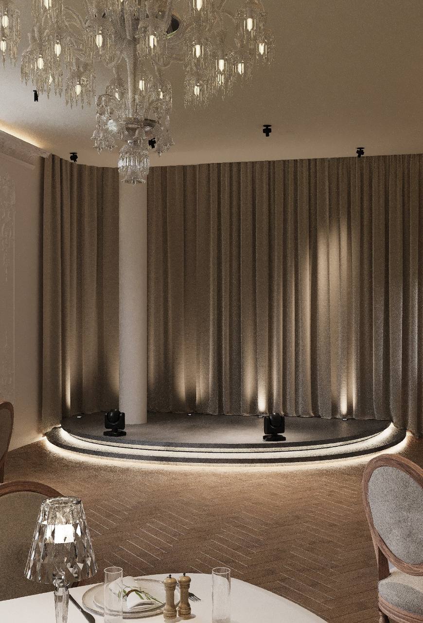ПРОСТОРНЫЙ ЗАЛ С ОТДЕЛЬНЫМ ВХОДОМ ОФОРМЛЕН В СТИЛЕ СОВРЕМЕННОЙ КЛАССИКИ: