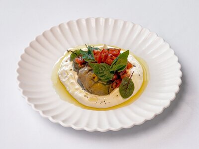 артишоки на гриле, томатная сальса, греческий йогурт, базилик