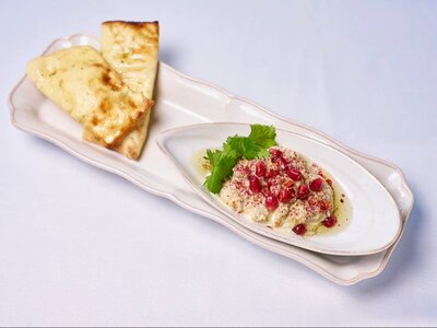Мезе баклажаны — изысканная холодная закуска, в которой нежные баклажаны гармонично сочетаются с сочным гранатом, ароматным оливковым маслом, пикантным сумахом и свежей кинзой