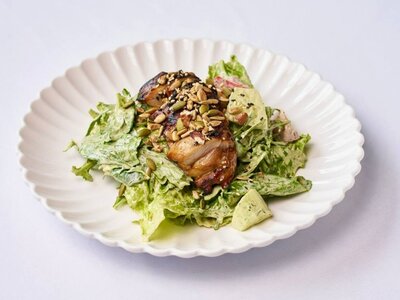 микс зелени, соус шанталь, розовые томаты, огурцы, микс семян, курица якитори, базилик