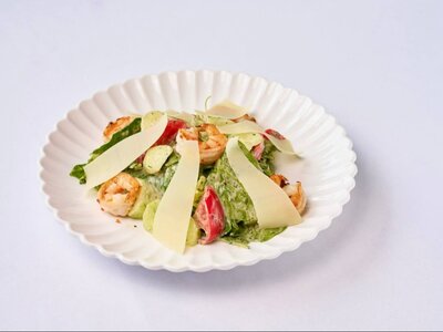 Лёгкий и свежий салат сочетает в себе микс зелени, розовые помидоры и огурцы. Креветки добавляют блюду насыщенный вкус, а соус шанталь придаёт пикантные нотки. Завершают композицию базилик, пармезан и микс семечек