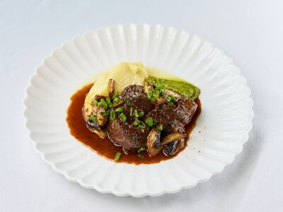 Щечки говяжьи с картофельным пюре и грибами • 1540 ₽