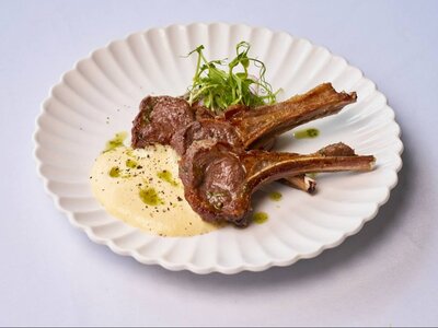корейка баранья, зелень, сырный мусс, красный лук, болгарский перец