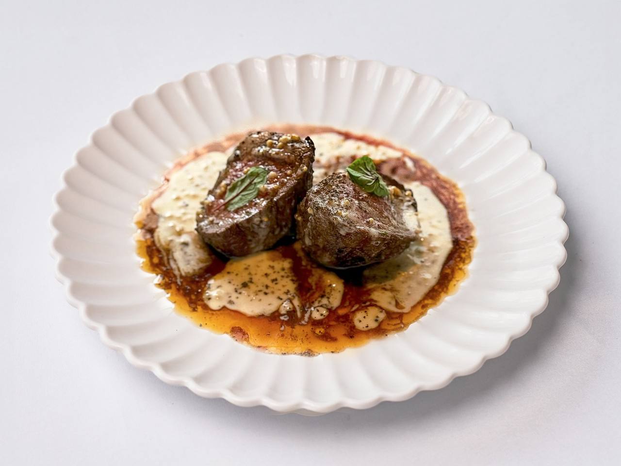 Вырезка говядина Prime Beef, соус демигласс, соус качо-э-пеппе (соус "Качо-Э-Пеппе" - соус на основе сливок, молока, пармезана, козьего сыра, коньяка, меда, желка яичного, перца молотого черного, горчицы), микро зелень.